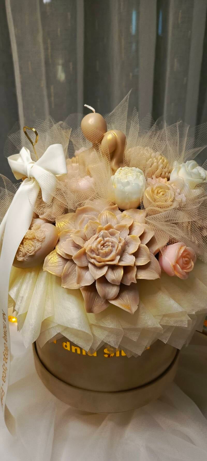 W środku znajduje się naturalna świeca sojowa, starannie zapakowana w elegancką oprawę i przewiązana wstążką z personalizowaną dedykacją.
